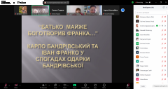 Старша наукова співробітниця музею Соломії Крушельницької Галина Тихобаєва представила доповідь «Батько майже боготворив Франка…» Карло Бандрівський та Іван Франко у спогадах Одарки Бандрівської». Модераторка міждисциплінарного наукового семінару, директорка Інституту франкознавства Наталя Тихолоз розпочала засідання інформацією про надання почесного звання член-кореспондент НАН України завідувачеві відділу франкознавства Інституту Івана Франка НАН України, багаторічному учасникові семінару «Перехресні стежки» Миколі Легкому. Ця приємна новина викликала хвилю емоційного піднесення, учасники бажали Миколі Легкому подальших відкриттів та здобутків у наукових літературознавчих пошуках. Після вітальних слів модераторка представила доповідачку та надала їй слово.