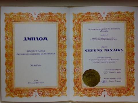 На підставі виборів та Ухвали Загальних зборів НТШ в Україні від 8 вересня 2017 р. Євгена Нахліка обрано дійсним членом Наукового товариства ім. Шевченка (Літературознавча комісія).