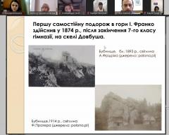 Аби по-справжньому відчути чари Франкових мандрів, розповідь Наталії МИСАК було проілюстровано візуальними презентаціями — цінними архівними світлинами і листівками із зображеннями мальовничих краєвидів Буркута, Криворівні, Жабйого та околиць Гуцульщини. Розмову також збагатили яскраві подорожні спогади І. Франка та інших мандрівників, які побували в “українських Атенах” — Криворівні.
