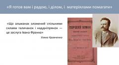 Далі доповідачка розглянула визначну роль, яку відіграв Франко у виході першого жіночого альманаху «Перший вінок», залишаючись його «тіньовим», «залаштунковим» редактором, коректором і промотором. Доповідачка навела цитату письменниці Уляни Кравченко «Що альманах зложений спільними силами галичанок і наддніпрянок — це заслуга Івана Франка» як свідчення усвідомлення самими авторками цього видання визначної ролі, яку відіграв Франко у його появі й тій консолідаційній меті, яку в нього було від початку закладено. Адже саме Франко, маючи контакти наддніпрянських авторок, зокрема Олени Пчілки та Ганни Барвінок, допоміг Кобринській залучити їх до видання, а крім того, особисто листувався з ними, залагоджував особисті конфлікти та непорозуміння і всіляко підтримував молодих письменниць-початківців. Денис Лукіянович, якого зацитувала Алла Швець, наголошував, що «Передові жінки тих часів – це духовні діти Франка».