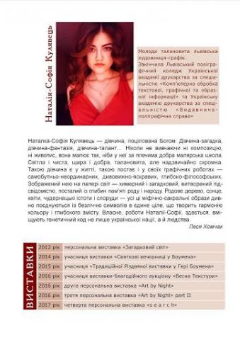 10 вересня 2018 р. Інститут Івана Франка НАН України спільно з Союзом Українок запрошують на відкриття п’ятої персональної виставки графічних робіт «Світ Софії» молодої львівської художниці Наталії-Софії Кулявець.