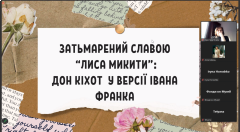 Доповідачка схарактеризувала передумови написання й історію трьох редакцій (видань) Франкового переспіву 1892, 1899 та 1913 років, а також докладно спинилася на особливостях першопублікації в дитячому журналі «Дзвінок» 1891 р. (засновником і редактором якого був Володимир Шухевич) та наступних допрацьованих версій. У фокусі виступу була низка питань, на які Л. САЛІЙ намагалася дати чіткі відповіді, як-от: чи вважав І. Франко свій поетичний переказ Сервантесового роману вдалим? як поставав текст? як часто і чому впродовж останніх десятиліть свого життя митець повертався до тексту поеми? яким чином переробляв, доопрацьовував твір, як намагався наблизити до рівня сприйняття юного читача? які сюжетні моменти та персонажі з роману лягли в основу Франкової поеми: чи поет не відступав від естетичних рамок оригіналу, зберігаючи іспанський колорит, чи на свій розсуд істотно прагнув його українізувати?